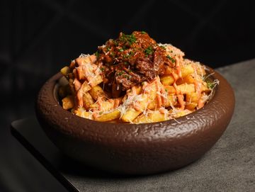 بطاطس مقلية مع شرائح لحم مطبوخة على نار هادئة بالفينو وهاوس صوص وجبنة بارمجان وبصل اخضر