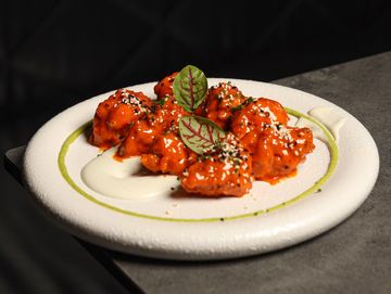 Boneless Hot Chicken Cubes with Gochujang Mayo topped with Sesame, Chives, Basil Oil & Blue Cheese Aioli