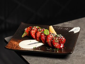 صوص طماطم، بافلو موزاريلا، عيل اسود حار، جبنة بوراتا، زيت زيتون وجبنة بارمجان