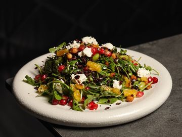 رز اسود، جرجير، جبنة فيتا، رمان، بذور سمسم، قطع برتقال، حمص محمص، ادامامي وصوص البالسميك
