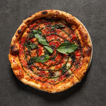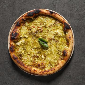 New York Style Pizza Dough, Tomato Sauce, Buffalo Mozzarella, Pesto, Fresh Basil, Chili Pepper, Lumi, Extra Virgin Olive Oil & Cherry Tomato