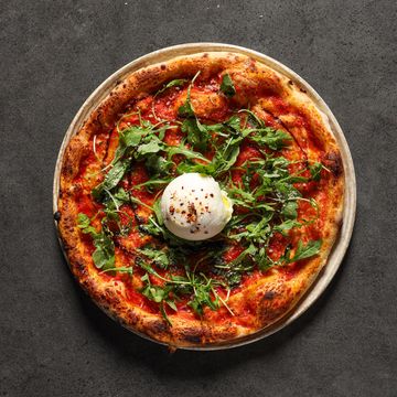 New York Style Pizza Dough, Tomato Sauce, Italian Rocca, Fresh Local Burrata, Balsamic Glaze, Chili Flakes & Extra Virgin Olive Oil