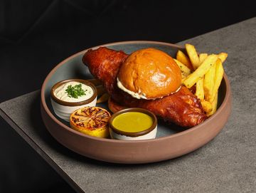 Crispy Fried Fresh Fish and Tartar Sauce in Toasted Brioche Bun served with French Fries, Herbed French Sauce & Lemon.