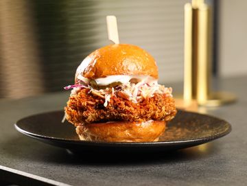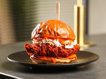 Crispy Fried Spicy Chicken, Yuzu Garlic Sauce, Honey Slaw & Pickles served in Brioche Buns.