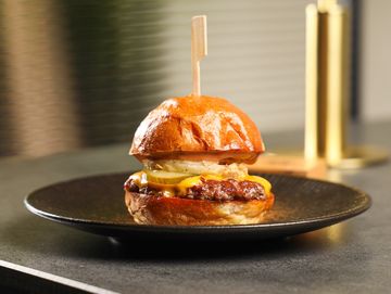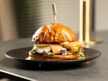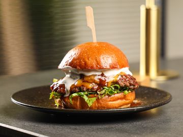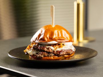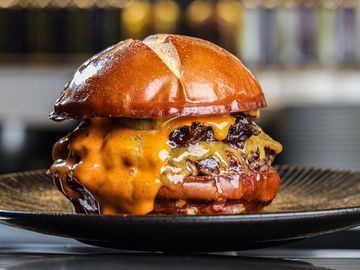 150 Grams Mature Wagyu, Cheddar Cheese, Caramelized Onions, Pickles & Gochujang Mayo in Pretzel Bun.