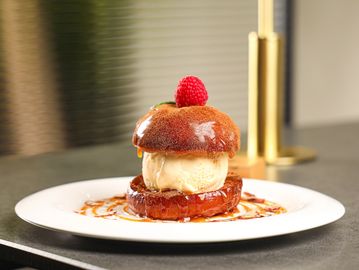 Fried Brioche, Vanilla Ice Cream, Candied Pecans, Toffee Cinnamon Sauce & Fresh Raspberry.