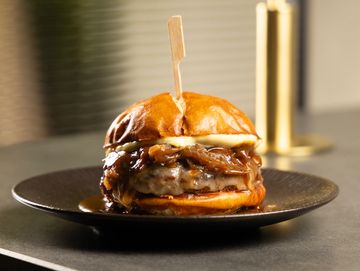 Double Wagyu Smash Patty, Provolone Cheese, Truffle Mushroom Duxelles, Onion Crisps & Black Truffle Garlic Mayo in Pretzel Bun.