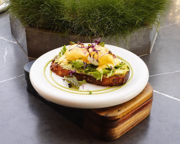 Toasted Sourdough, Cilantro Avocado, Italian Rocca, Poached Eggs, Creamy Dutch Sauce, Porcini Dust, Chili Flakes & Greens.