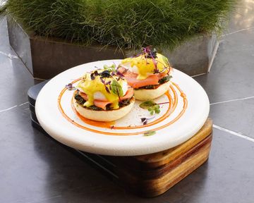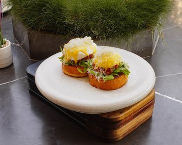 Toasted Cruffin, Fresh Italian Rocca, Tomato Jam, Poached Eggs, Creamy Dutch Sauce & Porcini Dust