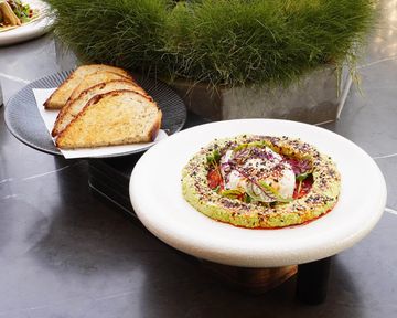 Toasted Cruffin, Cilantro Avocado, Confit Beef Brisket, Poached Eggs topped with Creamy Hareesa Dutch Sauce, Porcini Dust & Chili
