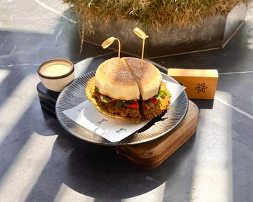 فلافل، خليط جبنة فيتا بالفستق، بصل مخلل، صوص ميسو بالمايونيز، ودبس وسلطة في خبز الانجلش مفن