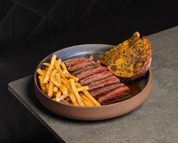 فلانك ستيك مع صوص نخاع العظم وبطاطس مقلية وخبر محمص بالزبدة والاعشاب