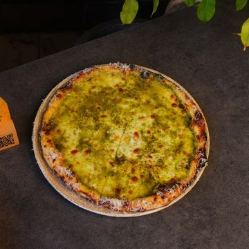 New York Style Pizza Dough, Tomato Sauce, Buffalo Mozzarella, Pesto, Fresh Basil, Chili Pepper, Lumi, Extra Virgin Olive Oil & Cherry Tomato