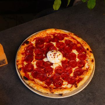 Tomato Sauce, Buffalo Mozzarella, Pepperoni, Hot Black Honey, Local Burrata, Extra Virgin Olive Oil & Parmesan Snow.