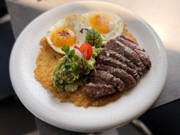 رقاقة بطاطس بالبارميزان، بيض مقلي، ستيك الـفلانك، أفوكادو