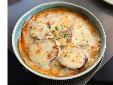 فلانك ستيك، بصل مكرمل، جبنة بروڤولون، صوص التشيميتشوري، وصوص نخاع العظم في خبز الساوردو